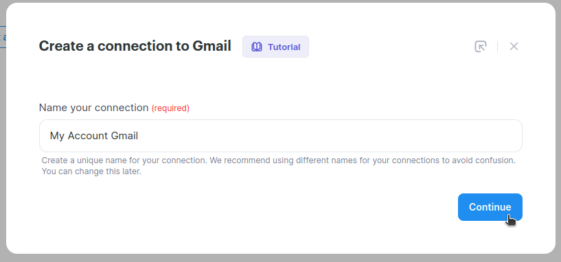 Otorgar acceso debajo del icono de Gmail. Luego, haz clic en Continuar ➜ Otorgar acceso nuevamente.5. Escribe un nombre para tu conexión y haz clic en