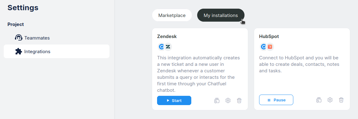 Configuración ➜ Integraciones en tu Panel de Chatfuel.2. Encuentra Zendesk en la lista y haz clic en
