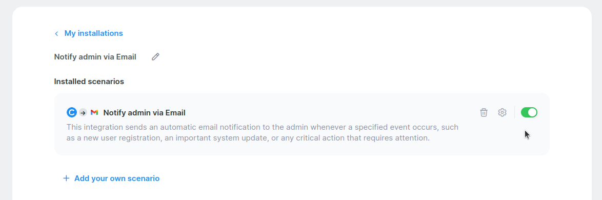Integrations ➜ Notify admin via Email.4. Click on the card to open its settings.
