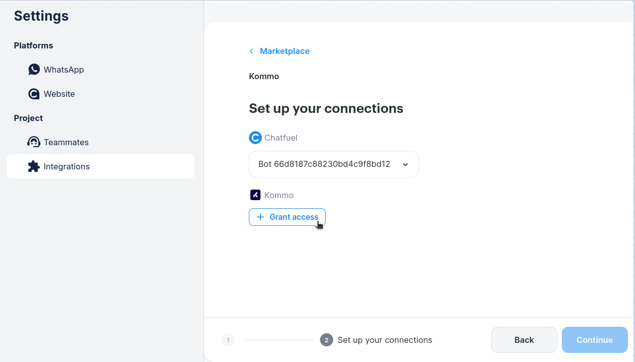 Grant access para permitir a integração do Kommo com o Chatfuel7. Permita acesso ao Kommo.