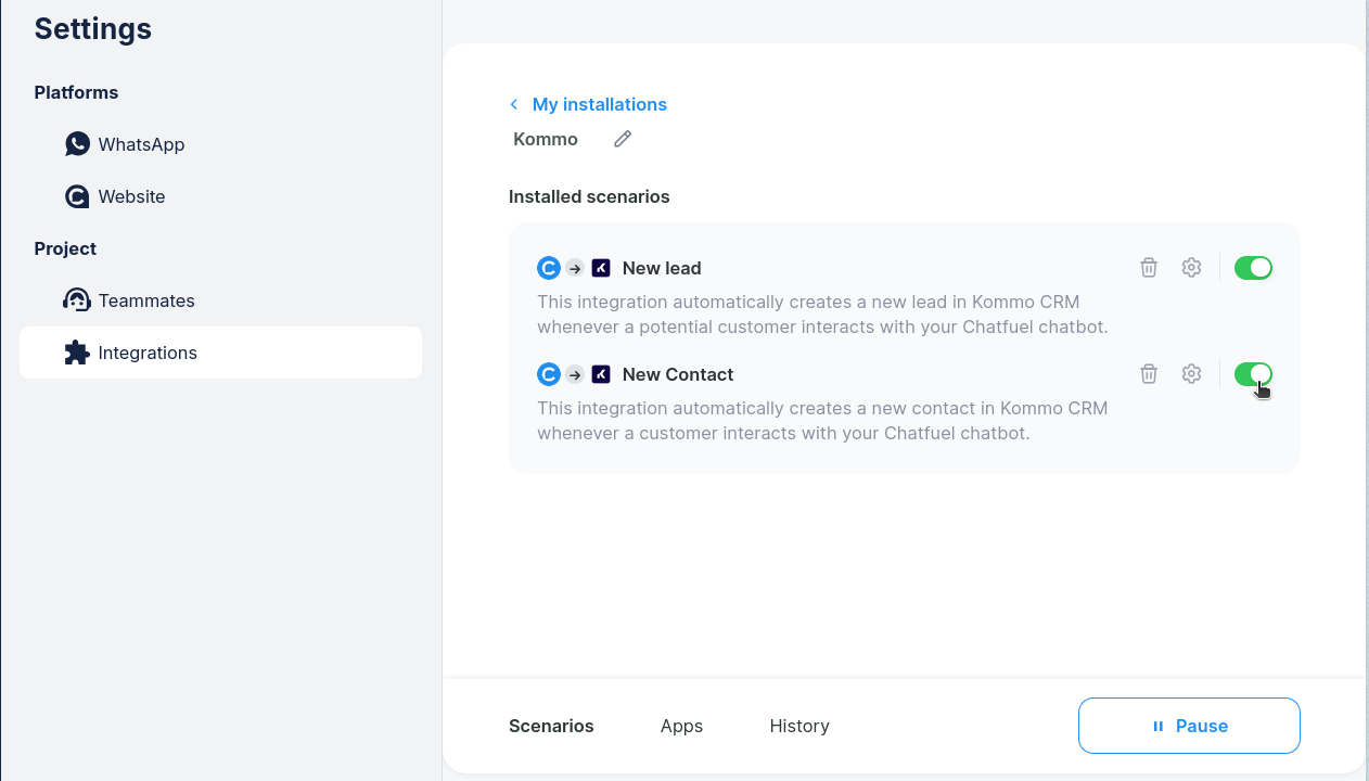 Com a integração do Kommo você pode conectar sua automação do Chatfuel à sua conta CRM do Kommo. Isso permite sincronizar automaticamente dados entre os dois sites e gerenciar seu pipeline de vendas diretamente dos seus chats.
